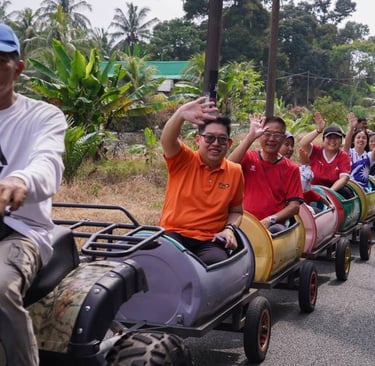 Jika biasanya ATV hanya ditunggang secara individu, Tong Train menawarkan konsep berbeza beberapa tong drum disambungkan seperti gerabak kereta api, membentuk satu “tren mini” yang bergerak mengelilingi laluan kampung. Aktiviti ini bukan sahaja sesuai untuk kanak-kanak, malah orang dewasa juga tidak ketinggalan mencuba kerana ia selamat, santai dan sangat menyeronokkan.